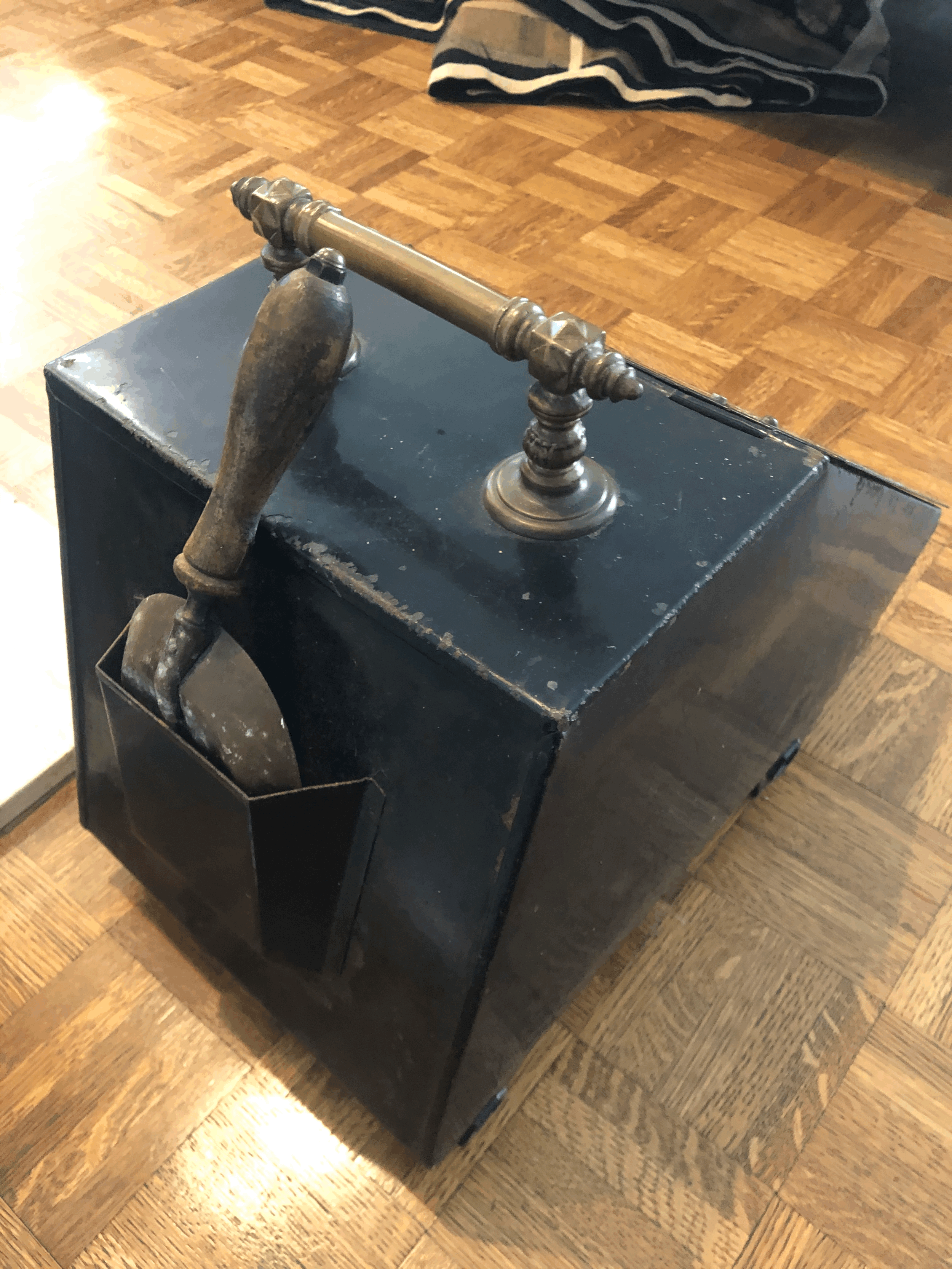 Late 18th century box for collecting ashes comes with a convenient Brass handle and brass scoop built in. Box in original condition.